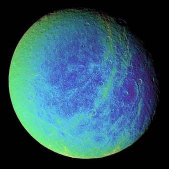 Rhea är den näst största av Saturnus månar. Som för månen vänder Rhea alltid samma sida mot Saturnus. Rhea har en av solsystemets äldsta ytor, som nästan inte förändrats på miljarder år.