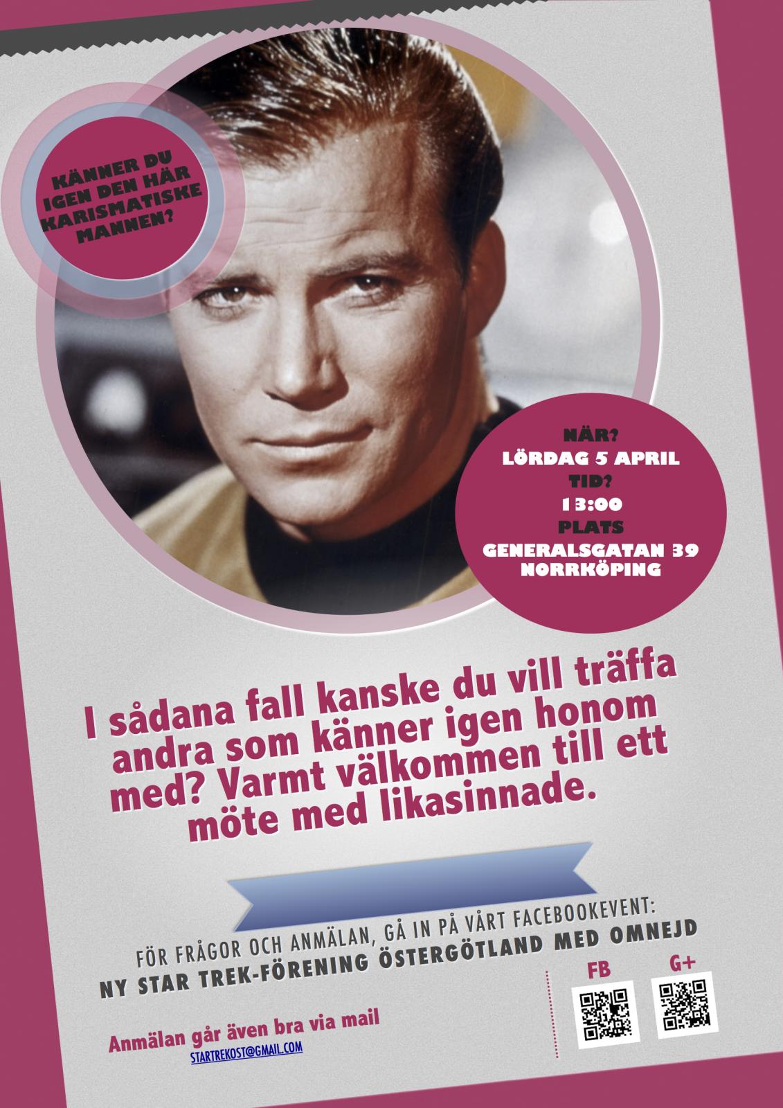 Johan Gulliver Norén Postad 19 Mars, 2014 Rapport Postad 19 Mars, 2014 Hej! Jag har suttit idag och fixat med en affisch. Tyck till lite, går fortfarande att ändra om det är något. Tanken är även att byta ut Kirk till Picard och/eller någon annan kapten på några ex. Jag kan skriva ut i färg och även i A3. /Johan Citera