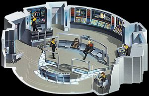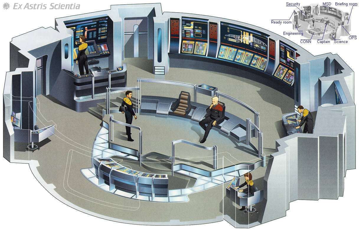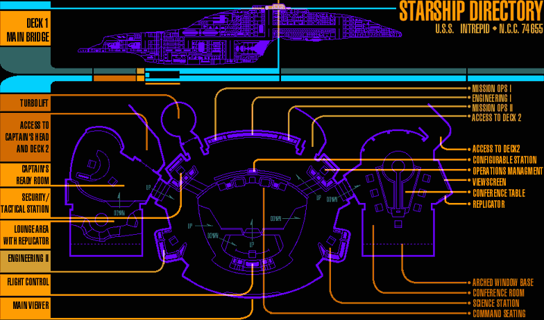 (eng. Main Bridge)Huvudbryggan är skeppets kommandocentral. Härifrån kan hela skeppet styras. Det är även här som de högre officerarna spenderar största delen av sin tid när de är i tjänst. Här finns stationer för rodret, taktik och säkerhet, vetenskap och maskin. Samtliga arbetsplatser kan dock konfigureras så att de passar den uppgift de för stunden behöver göra. På bryggan finns också en stor skärm för kommunikation och visning av andra data. Denna används allt som oftast vid första kontakter med olika raser.