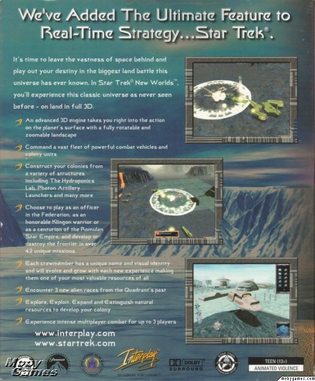 I Star Trek: New Worlds är du en officer för en av tre fraktioner: Federationen, Klingonska Imperiet eller Romulanska Stjärnimperiet, och tilldelas uppgiften att bygga upp en fullt fungerande koloni. Kolonin skall innehålla fabriker som kan konstruera olika typer av farkoster och byggnader. För att åstadkomma detta behöver du råmaterial, som dilitium, magnesit och kelbonit. Du måste också förse kolonin med kraftgeneratorer för att den skall få tillräckligt med energi, utrymme för fler kolonister, personal, osv. Som Star Trek-spel betraktat är Star Trek: New Worlds ganska unikt, vana som vi är med att det mesta annars händer ute i rymden.