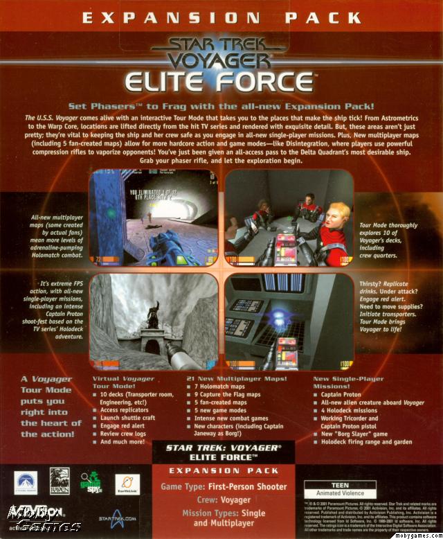 I expansionen för Star Trek: Voyager - Elite Force kan spelaren via ett virtuellt Voyager-läge utforska 10 fler däck på USS Voyager. Dessutom har man lagt till fem nya spellägen för multiplayer: assimilering, actionhjälte, eliminering, desintegration och specialiteter. Två nya stridskampanjer har också tillkommit, vilka utspelar sig på holodäcket: Kapten Proton och en Klingonbasinfiltration.