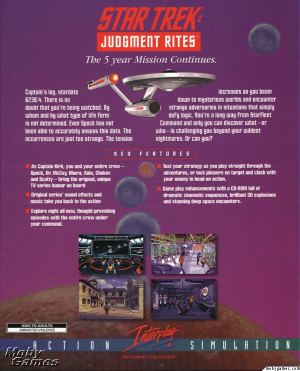I spelet som gavs ut av Interplay 1993 ger sig besättningen från originalserien ut på nya äventyr. I Judgment Rites får vi åter stifta bekantskap med Trelane, det allvetande barnet från avsnittet The Squire of Gothos. Besättningen strålar ner till mystiska världar och träffar på märkliga fiender i situationer som trotsar all logik. Du är långt från Federationen och endast du kan lösa vad som förefaller vara som de värsta mardrömmar.