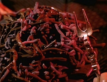 Fylld wentliansk kondororm var huvudrätten vid en affärsmiddag som iordningsställdes av Quark för Palamars regent 2373 på Quark's.