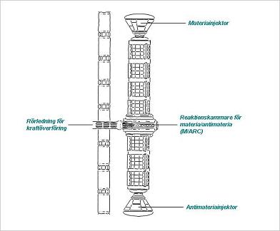 För att få materia och antimateria att kollidera med varandra och generera kraft (när materia och antimateria sammansmälter, annihileras de fullständigt och omvandlas till ren energi), används två injektorer (Eng: reactant injectors) som sitter i vardera änden av ett reaktionstorn (Eng: matter/antimatter reaction assembly (M/ARA)) (Figur 7). Injektorerna är konstruerade på olika sätt för att kunna hantera de två olika formerna av materia. I materiainjektorn förbereds deuterium för att skjutas in i reaktionskammaren (Eng: matter/antimatter reaction chamber (M/ARC)), i antimateriainjektorn antideuterium. Små kulor av deuterium skapas, som upphettas genom bearbetning med kraftiga magnetfält, vilket resulterar i en joniserad gas. Samtidigt upphettas portioner av antideuterium, som när det uppnått gasform, transporteras med användning av magnetfält in i antimateriainjektorn.