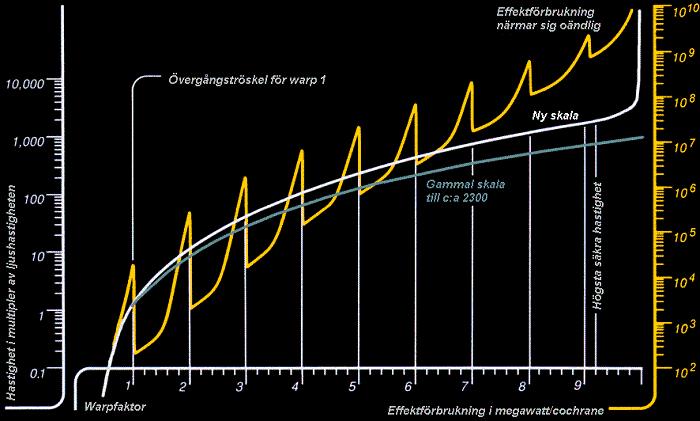 I några sällsynta fall har skepp färdats otroliga sträckor - t.o.m. mellan galaxer - på bara några sekunder. Dessa resor ägde förmodligen rum i warphastigheter runt 9,9999999996, men Federationens teknologi klarar inte av att mäta hastigheter som närmar sig dessa extrema warptal. Att passera warpbarriären kräver oproportionerligt mycket energi, men när väl warptröskeln passerats, minskar energibehovet som behövs för att hålla warpfältet intakt (Figur 4). (Warpfaktorer) |
